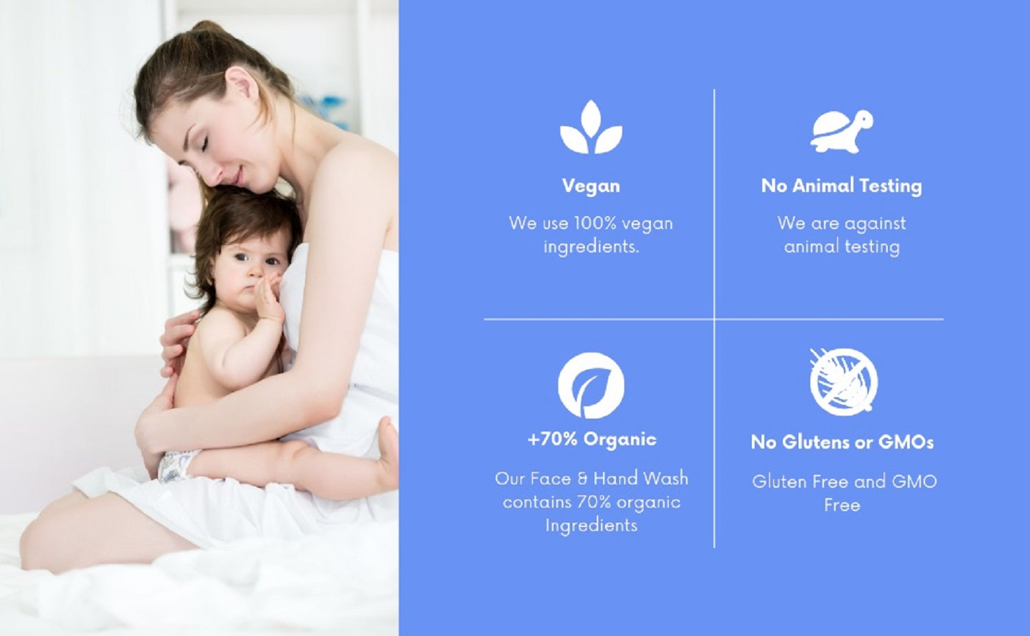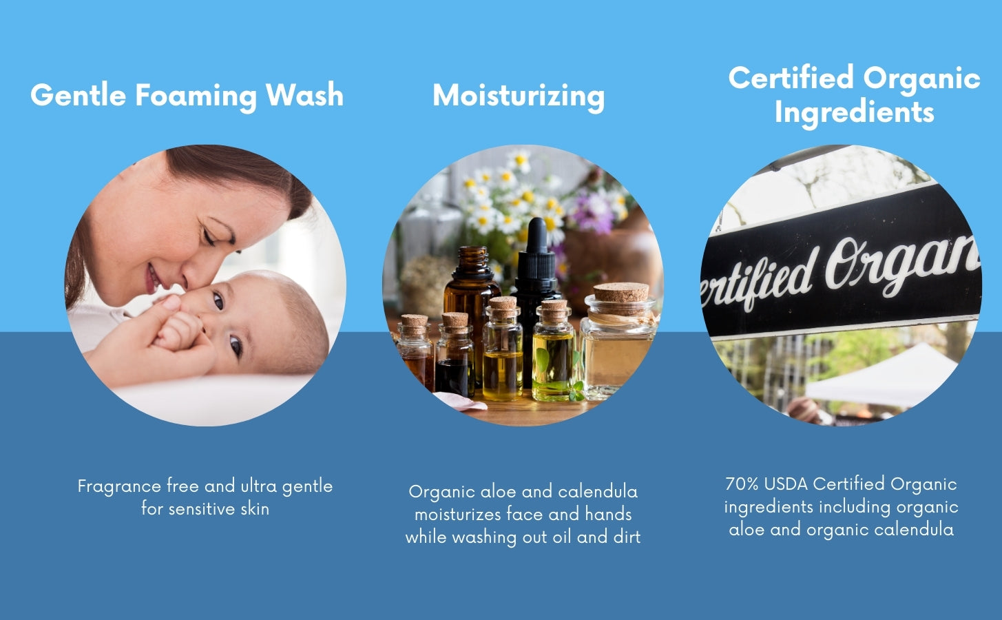 A foaming face and hand soap like no other. It is tear free, 70% organic, fragrance free and amazingly mild.