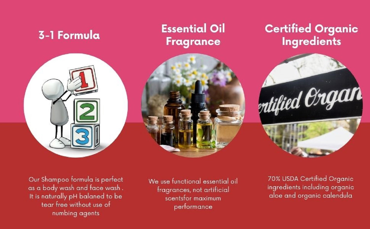 Made with organic aloe, calendula, and chamomile, our formula is ideal for problem and sensitive skin. It leaves hair soft and luxurious, and is free of SLS and parabens.